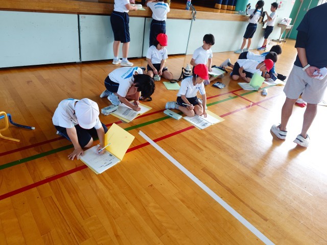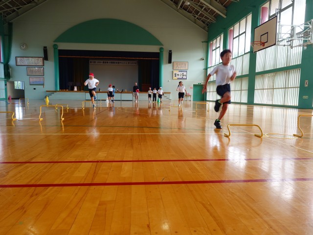体育でハードルの練習をしています。