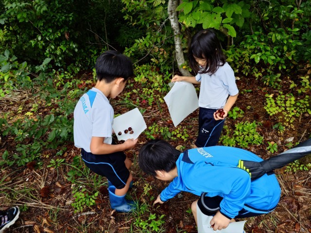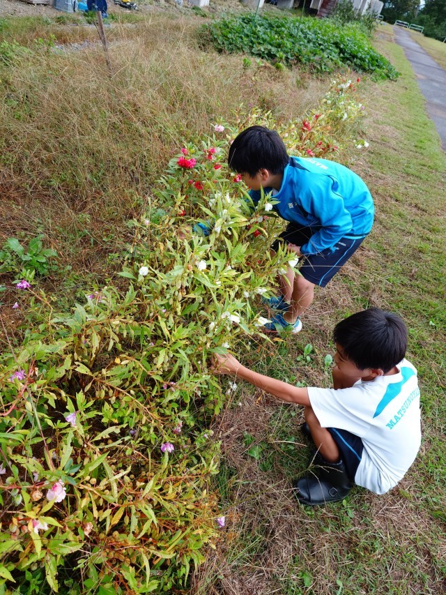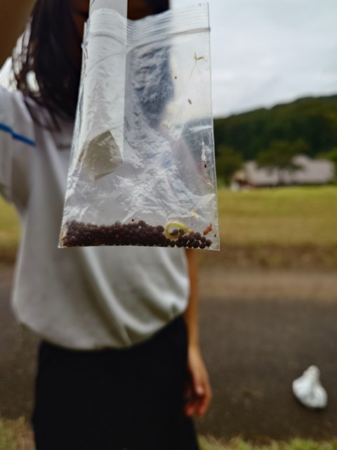 育てていたホウセンカの種取りに行く途中、栗の実拾いもしていきました。