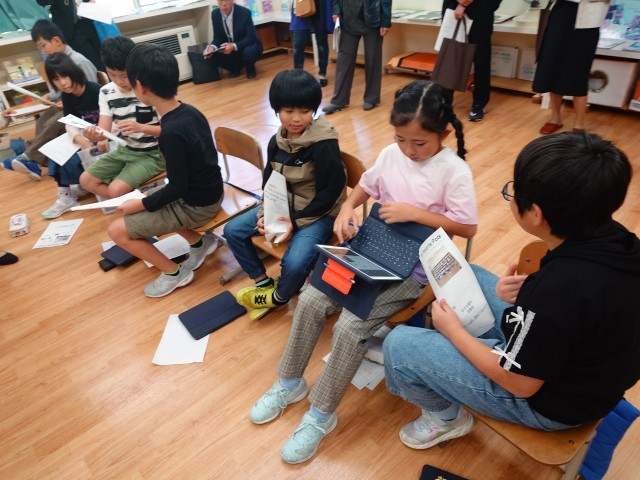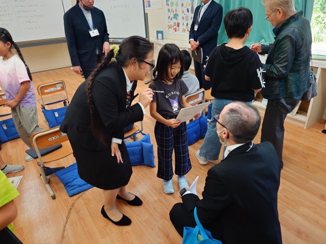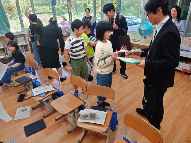 サミットで来場した方たちに、まつのやま学園のお気に入りの場所を英語で紹介しています。