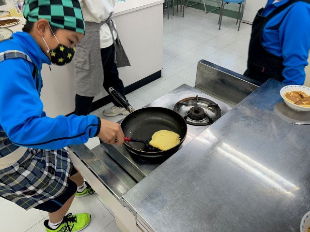 放課後、いいにおいがするなぁ・・・と、調理室をのぞいてみると、アウトドア部の子どもたちがインドアでホットケーキを作っていました。