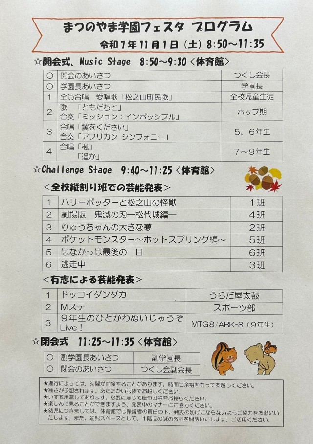 11月1日(土)恒例の「まつのやま学園フェスタ」を行います。