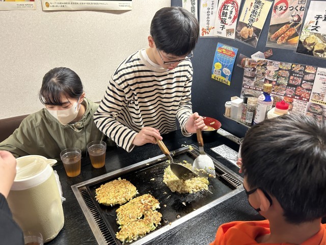 お昼ごはんは、浅草で「お好み焼き&もんじゃ焼き」です。作り方を教わって、自分たちで焼きました。ヘラを使って、熱々のもんじゃ焼きを食べました。