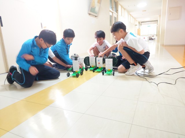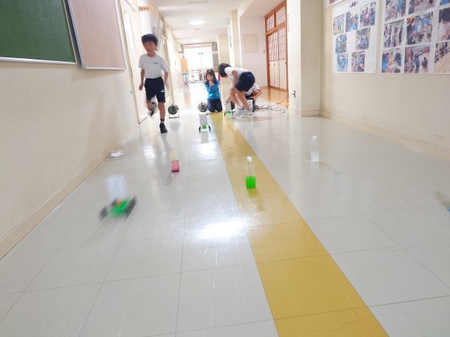 送風機を集めてより遠くまで走らせたり、障害物を避けて走らせるにはどうしたら良いのか試したりしていました。