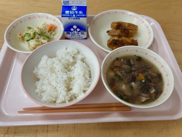 献立 主食(コシヒカリごはん)、主菜(くるまふフライほっぽろソース)、副菜(くきわかめサラダ)、乳製品(牛乳)、具沢山汁(ずいきのみそ汁)
