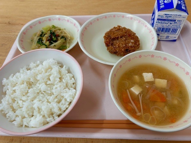 献立 ごはん、牛乳、バリバリ伝説メンチカツ、青菜のじゃこあえ、里芋のみそ汁
