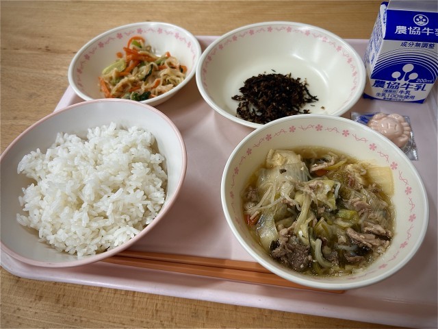 ・ 献立 ご飯、牛乳、ふりかけ、アーモンドあえ、すき焼き汁、レアチーズ