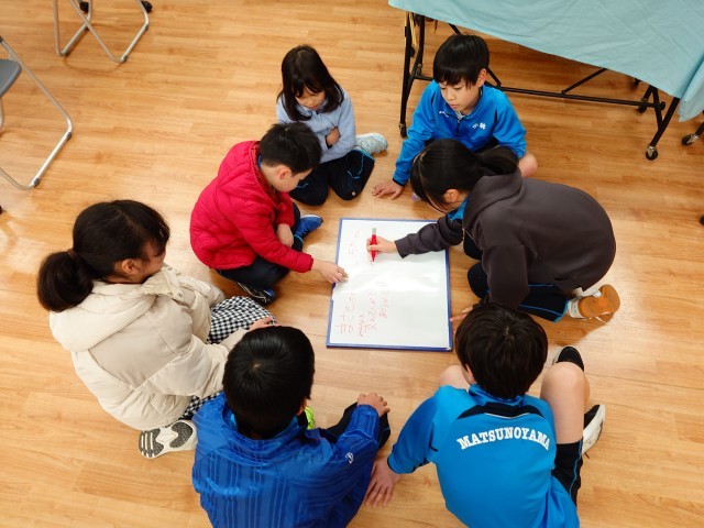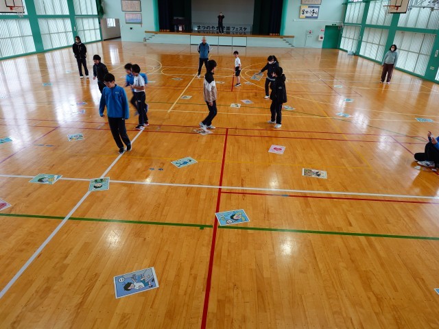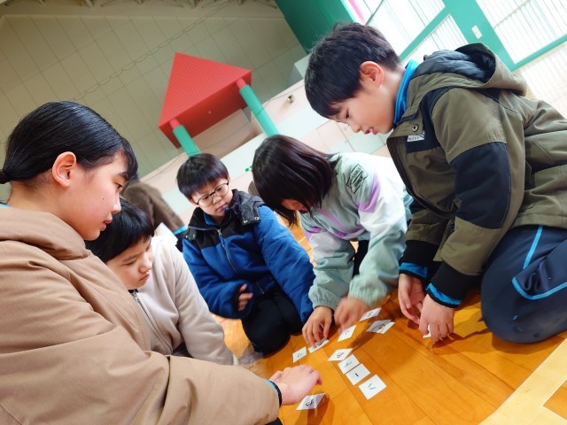 縦割り班ごとに、ヘルス委員会が用意した活動(健康ジャンボかるた、人間知恵の輪、9年生に感謝を伝えよう、健康クイズ、無言で並べ替え、高速ラジオ体操)に挑戦しました。