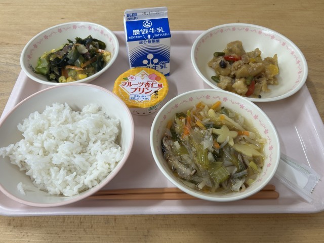 献立 ご飯、牛乳、鱈中華炒め、海藻サラダ、春雨スープ、フルーツ杏仁プリン