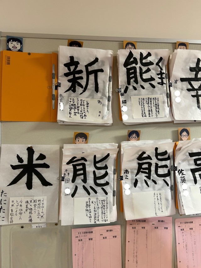 6年生(担任含む)が、事前に書写の時間に書いた今年の漢字一字、予想した「熊」「米」が上位に入りました。子どもたちがこの一年をどう見てきたか。また、予想の理由にも個性が光ります。