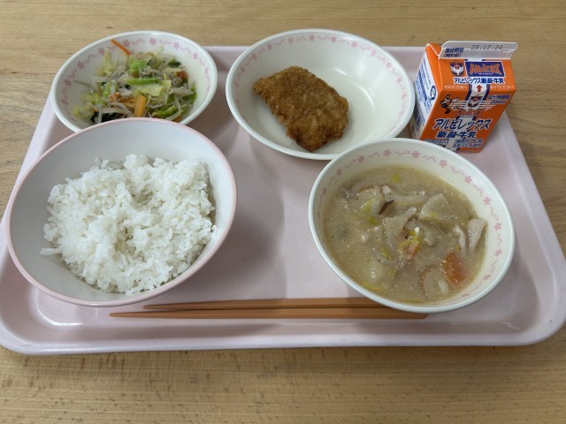 献立 ご飯、牛乳、タレカツ、じゃこおひたし、鮭粕汁