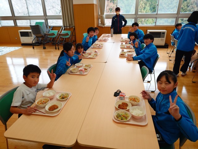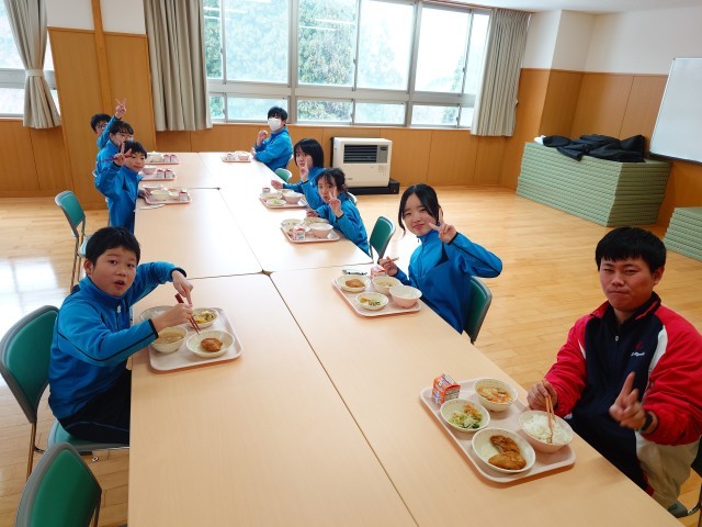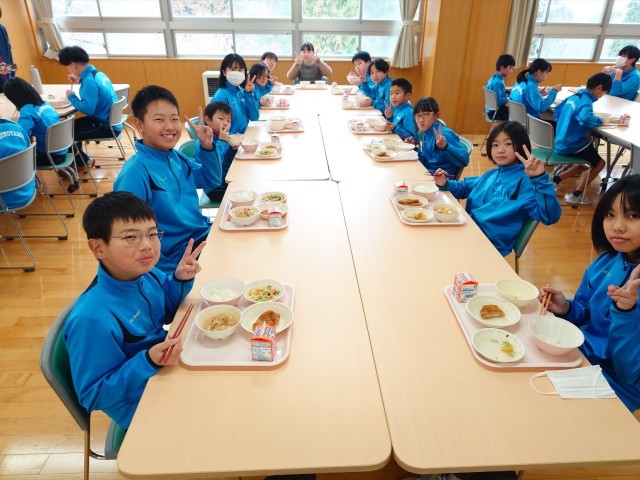 縦割り班で一緒に給食を食べて親睦を深めています。