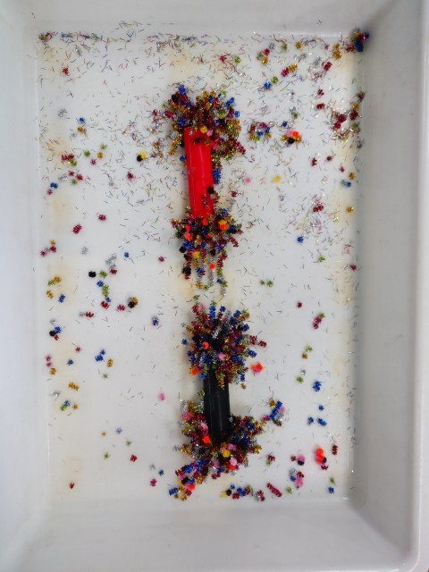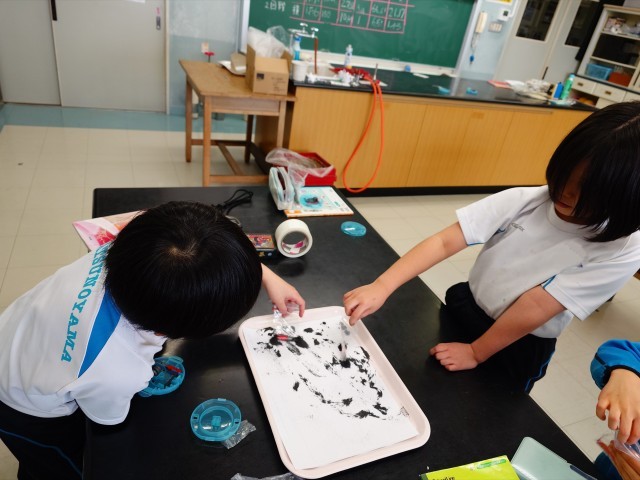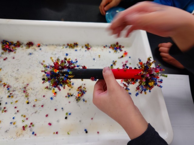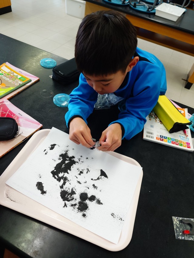 砂鉄を磁石に近づけてみると、端っこの方がたくさんつくことが分かりました。