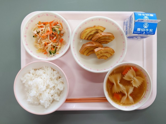 ごはん、牛乳、味付け海苔、車麩の扇子揚げ、花火サラダ、蟲の呼吸スープ