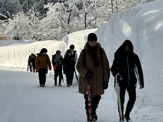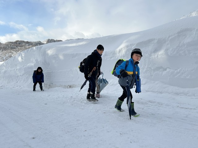 節分の朝は、なんともきれいな朝日に照らされての登校となりました。午前9時現在の松之山支所の積雪量は330cmです。除雪をしていただいているおかげで路面はきれいですが、道路脇の雪壁は350cmをはるかに超えています。