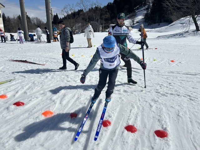 「挑戦しよう!」ゲストコーチの声が松之山クロスカントリーコースに響きます。