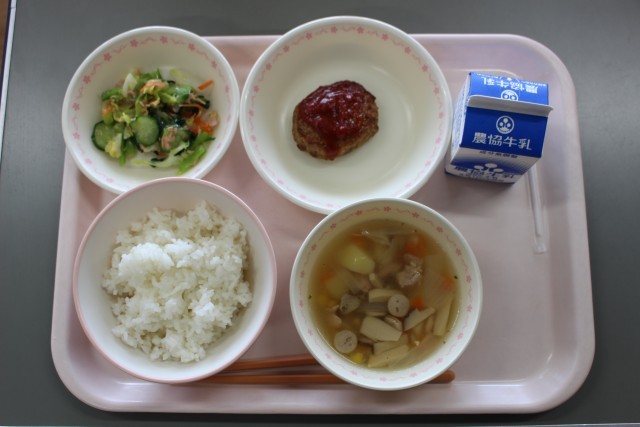 今日の献立は、ごはん、ハンバーグのトマトソースかけ、ツナサラダ、コンソメスープ、牛乳です。