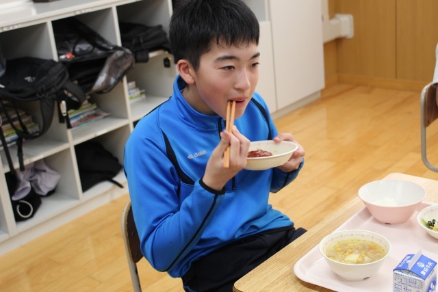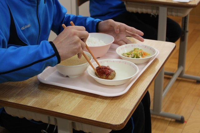 食事中に放送されるもぐもぐメッセージには次のようなことが書いてありました。「食事のマナーは、一緒に食べる人が気持ちよく食事ができ、自分もおいしく食べやすくなるように考えられました。今日のハンバーグにガブッとかぶりついている人はいませんか?箸で一口分に切って口に運びましょう。食器をもって、姿勢よく食べるとさらにいいですね。」