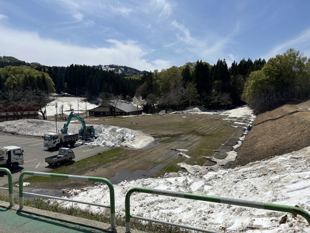 現在、地域の業者の皆さまのご協力により、グラウンドの除雪作業を行っていただいています。今月末には、グラウンドで短距離走やスポーツフェスティバル(運動会)に向けた練習ができるようにと、急ピッチで作業を進めてくださっており、心からありがたく感じています。