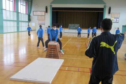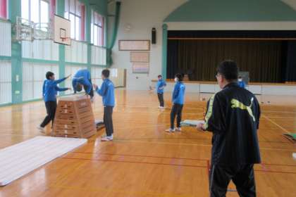 今日の2時間目、7年生は保健体育でした。一人一人が跳んだり、上に載ったり何回も跳び箱で練習をした後、実技テストでした。最初に、開脚跳び、次に台上前転でした。自分で決めた高さの跳び箱で゛チャレンジしていました。