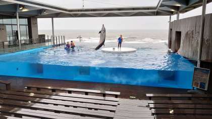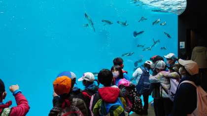 一匹一匹、誰が何匹のアジを食べたか数えながら餌やりをしている飼育員さん。