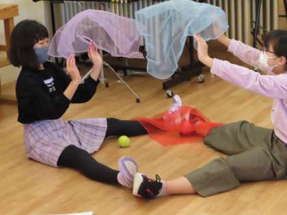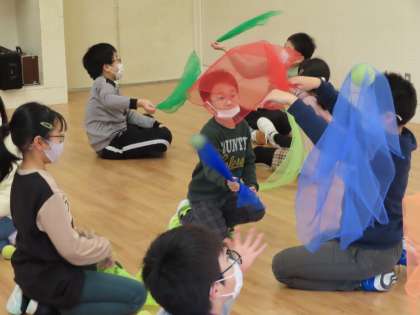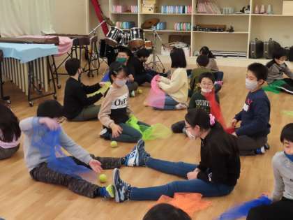 5,6年生の音楽の授業で、今日はハンガリー舞曲第5番を鑑賞しました。曲の速さの変化などに合わせて、リトミックスカーフをふわふわとさせたり振り回したり、ボールをどんどん転がしたりしました。聴き取ったことをもとに、グループで様々なアイディアを出し合っていました。フィニッシュでは決めポーズをする!など、大人では思いつかないようなことをしている児童もいました。