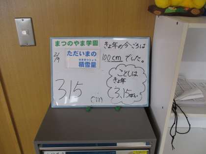 スキー大会(学習参観日)の振替休業日明けのまつのやま学園、外気温はマイナス5度、積雪量はご覧のとおりです。また、ずいぶん増えました。