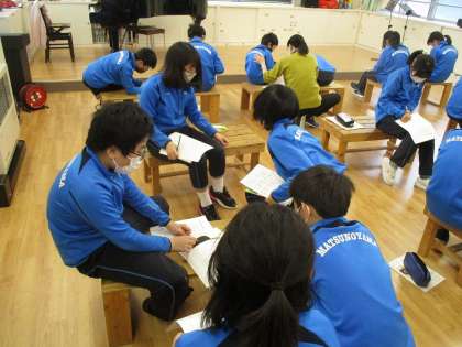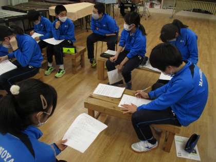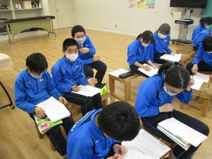 この時期の定番「旅立ちの日に」がCD歌唱で流れる中で、子どもたちは何やら話し合っています。