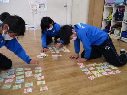 教室の中でも、ルールを工夫した百人一首遊びをしている子。坊主めくり的な要素も加えています。