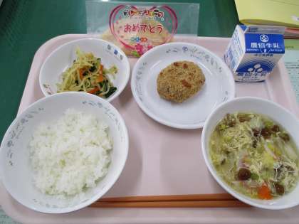 ・コシヒカリご飯 ・バリバリ伝説メンチカツ ・もやしのカレー風味サラダ ・かきたまスープ ・お祝いクレープ ・牛乳