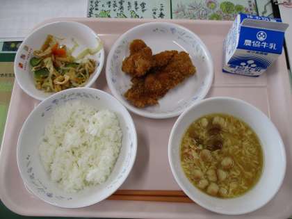 ・もやしとあぶらあげのごまずあえ ・きのこかき玉みそしる ・牛乳