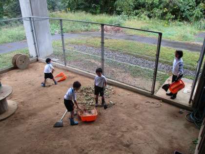 1年生はカンイチの小屋を掃除していました。食欲旺盛、出る方もたくさん(T_T)でも、ずいぶん手際がよくなって、こんなん、もうお手のものです。みんながきっちり動いているのが素晴らしいところ。約束どおり、カンイチのお母ちゃんお父ちゃんです。
