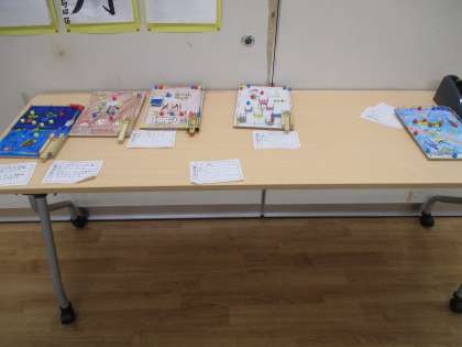 3年生と4年生が図工の時間に作った「コリントゲーム」がワークスペースに展示してありました。自由に遊べます。