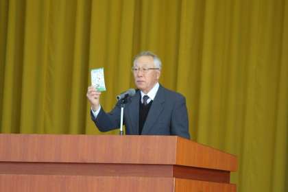 学園主催で探鳥会をしたり、こども野鳥の会の探鳥会をしたりと愛鳥活動も進んで取り組んでいるところですが、今日は松之山野鳥愛護会の村山暁会長様が来校され、改訂された「探鳥のしおり」を全校児童生徒・職員にプレゼントしてくださいました。ポケットサイズで使いやすく携行しやすい、ミニ図鑑です。