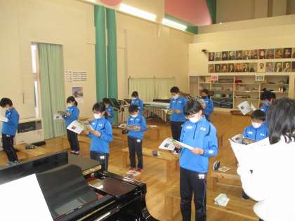 5・6年生は音楽でした。タイムリーなことに「冬景色」を歌っています。美しい歌詞と曲。昔からどの教科書にも載っている「共通教材」です。