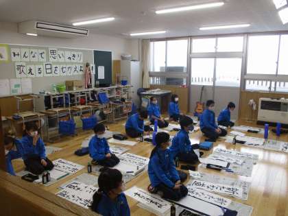 もう何回か練習しているので、厳密には書き「初め」ではないのでしょうが、今日も5・6年生ががんばっていました。「楷書」はすべての書法の基礎です。互いの息づかいが聞こえるような雰囲気の中、真剣に書いています。終わるとけっこう、疲れます(^^;)