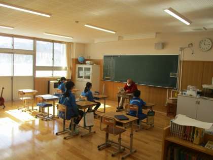7年生は英語です。今日はリスニング中心でしょうか。ALTの先生はハワイ出身。松之山の雪と寒さに驚いていますが、新たな経験!と前向きです。