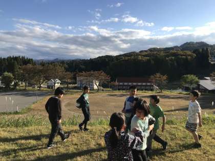 下校まで時間のある1年生から3年生の子どもたち。校舎の周りで鬼ごっこを始めました。まだ3時なのにもう太陽が沈みかかっています。本当に日暮れが早くなりました。季節は着実に冬に向かっています。ヤギとももう少しでお別れです。