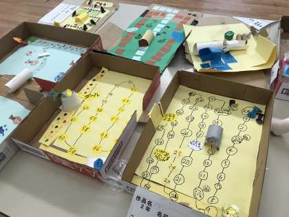 2年生の教室の前に図工の学習で作ったゲームが展示されています。「わくわくおはなしゲーム」は子どもたちがストーリーを作ったり、材料から発想を膨らませたりしながら考えたゲームです。いろいろなアイディアがあって面白いですね。みんなで楽しんでください。