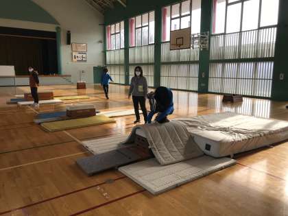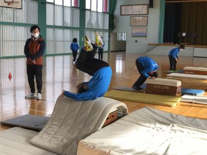 5・6年生の体育は跳び箱。今日は台上前転の練習です。うまく回るにはどうしたらいいかな?脚を伸ばして回るときれいに見えますよ。おっ、うまくいった。