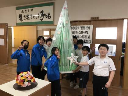 わっしょい、わっしょい。向こうからクリスマスツリーがやってきます。飾り付けを終えた4年生の子どもたちが玄関までツリーを運んできてくれました。