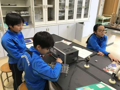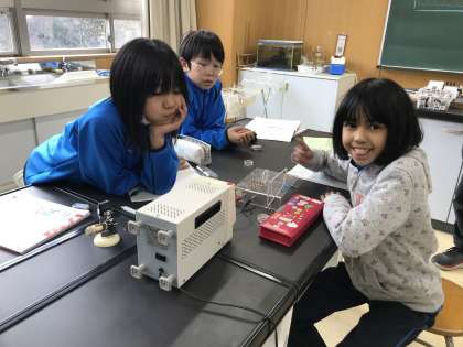 5年生は理科で電磁石の学習中。電気を流すとどうなるか、今日は方位磁針を使って確かめます。あんまりたくさん電流を流さないようにしてね。