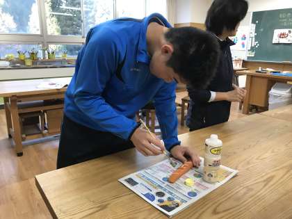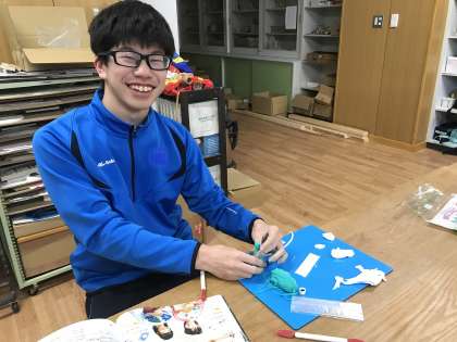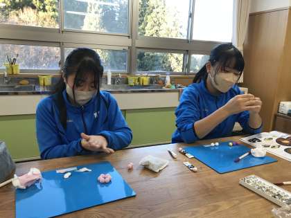 8年生は美術の学習で紙粘土を使って、本物そっくりな模型作品を作ろうとしていました。目標は和菓子だそうで、今日はその練習です。果たして何ができるのか?できあがったものはソフトクリーム?フランスパン?お酒のビン?アリゲーターガー?ユニーク過ぎてコメントできません。