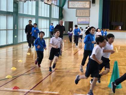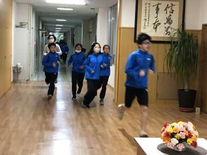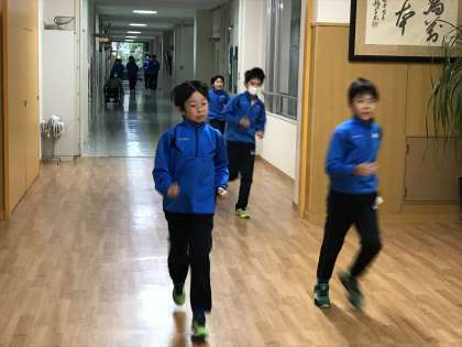 朝のいきいきアップ。子どもたちは校舎内や体育館を走ります。雨や寒さに負けません。