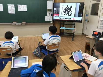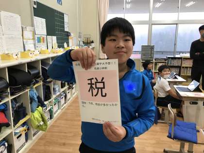 本日2時。今年の漢字1文字が発表されました。今年の漢字は「税」。3年生の子どもたちが予想しましたが、見事に1名が的中させました。すごい!おめでとう。