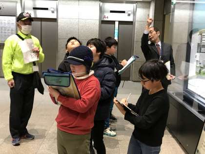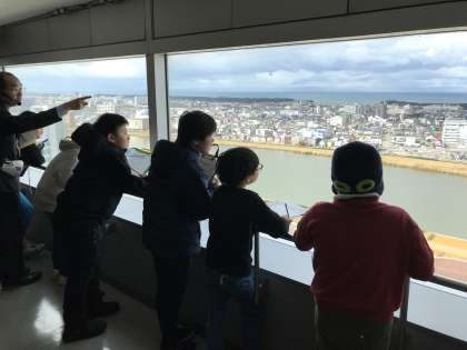 県庁に到着しました。議会庁舎は議会が始まっているために見学できませんでしたが、警察庁舎や行政庁舎を見学しました。天気がよくて18階の展望回廊からは佐渡や粟島が見えました。普段はあまり見られないのだそうです。たくさんメモをしたので案内の方にほめられました。