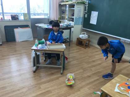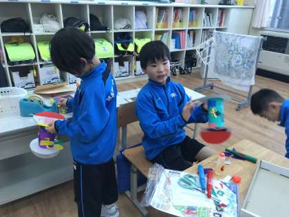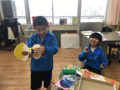 図工の学習で工作をしている1年生。筒の端に円盤が付いています。どうやら転がすとパタパタと動くようです。水族館やヤギの絵など模様はそれぞれです。これははにわかな?完成したらどんどん転がしてください。
