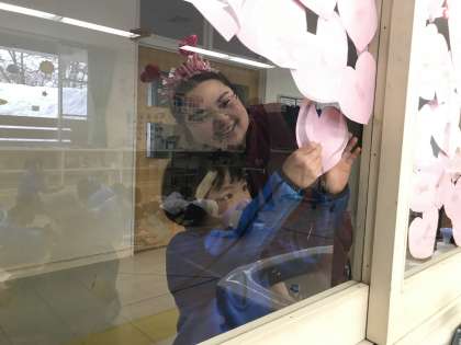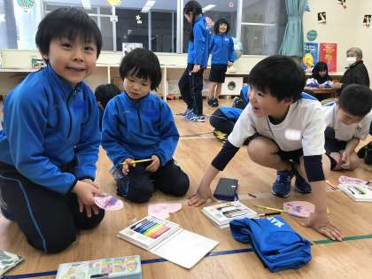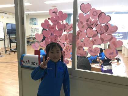 ハート型のピンクの紙に絵や英単語を描く子どもたち。自分の好きなものを描いてガラスに貼っていきます。メールボックスからハートがあふれていくようです。メールボックスはALTが作りました。1・2年生だけでなく、他の学年の子の作品もあります。