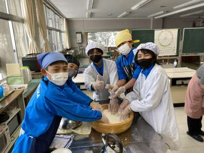 6年生の家庭科はあんぼ作りです。地域の方から教えて頂きながら、米粉を混ぜています。とっても良い香りです。