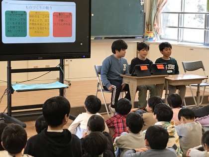 3年生の発表です。自分たちの感じた松之山の魅力を3つのグループに分かれて発表しました。タブレットや大型モニターを効果的に使ってまとめた資料を発表していて感心しました。