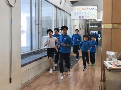朝のいきいきアップ。今日も校舎内の廊下や体育館を走ります。外はいい天気。さあ、走るぞー!